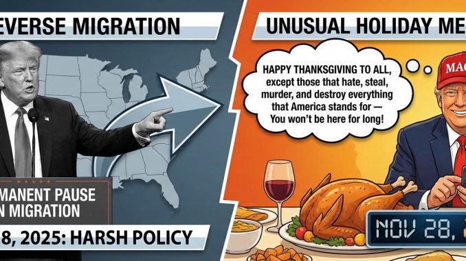 - Das Zitat: „Only REVERSE MIGRATION can fully cure this situation. Other than that, HAPPY THANKSGIVING TO ALL, except those that hate, steal, murder, and destroy everything that America stands for — You won’t be here for long!“ (Donald Trump, 28. November 2025)